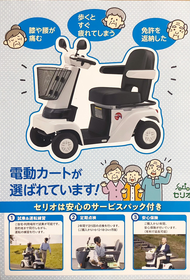 「膝や腰が痛む・・・」「歩くとすぐ疲れてしまう・・・」「免許を返納した・・・」といったお悩みがある方に朗報です! 坂本タンスでは、セリオの電動カートのご案内も受け付けております!